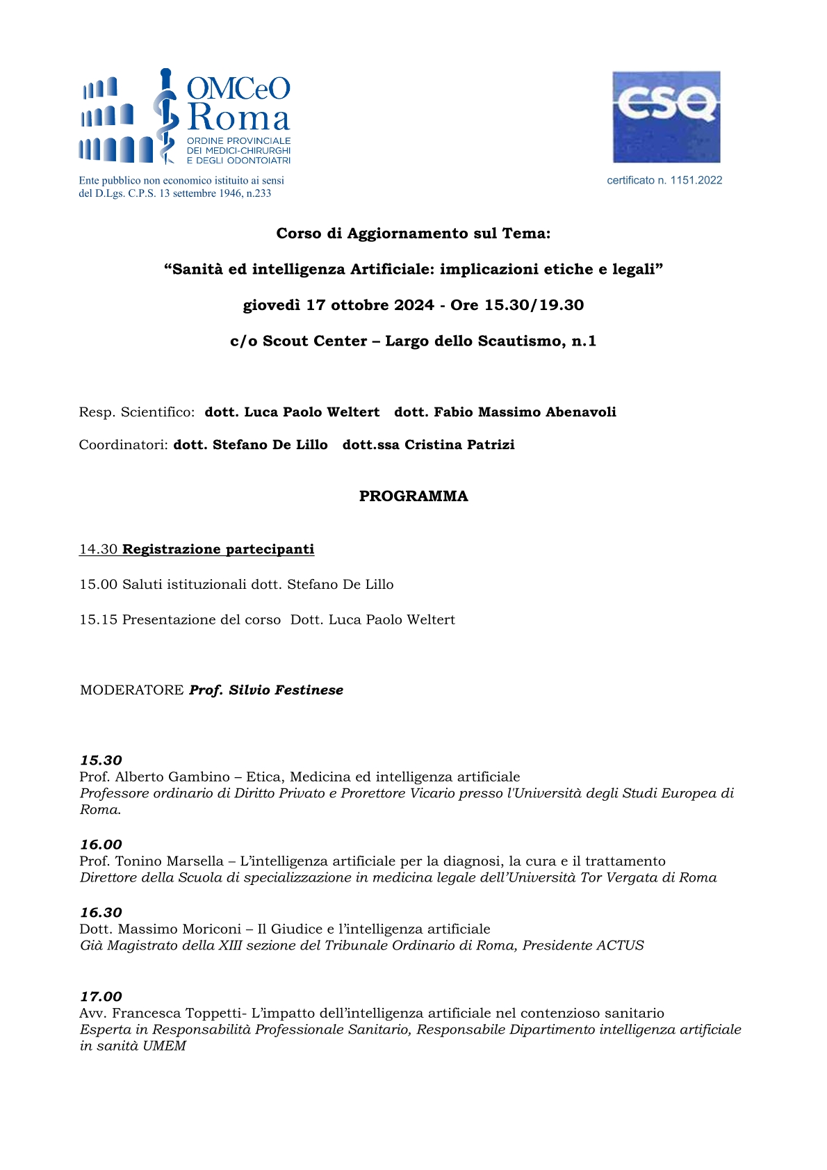 Corso di Aggiornamento sul Tema:“Sanità ed intelligenza Artificiale: implicazioni etiche e legali”